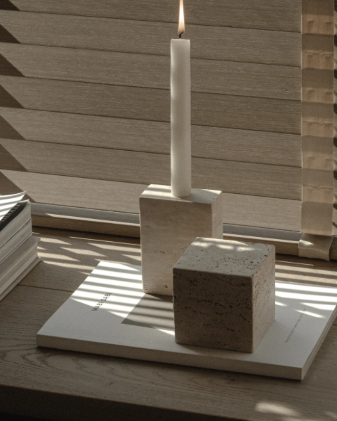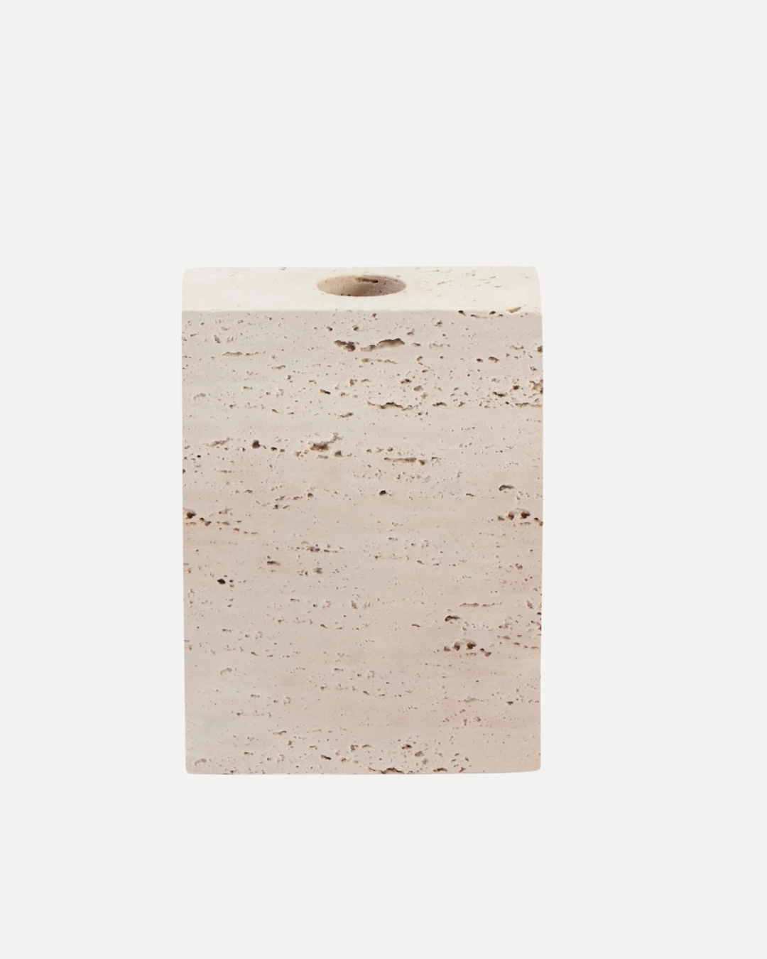 El exterior mantiene el carácter orgánico de la piedra, mientras la perforación interior se suaviza para recibir la luz.